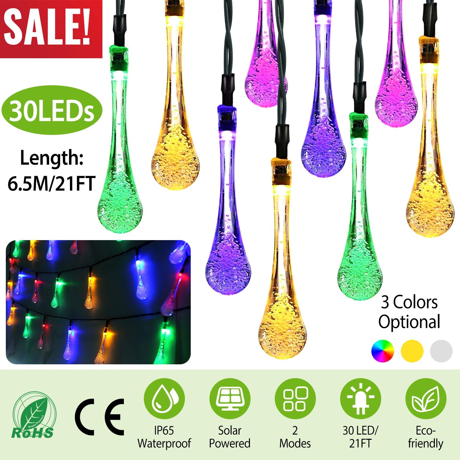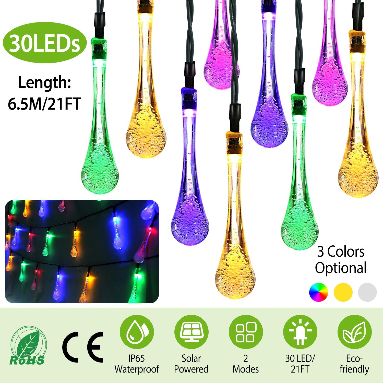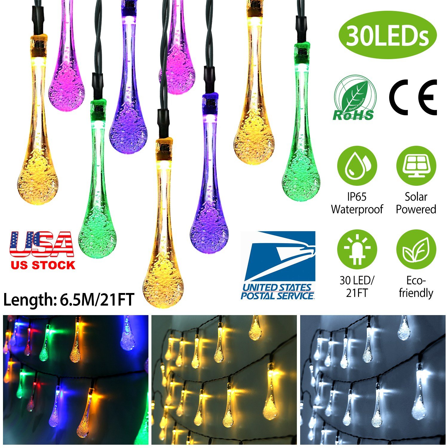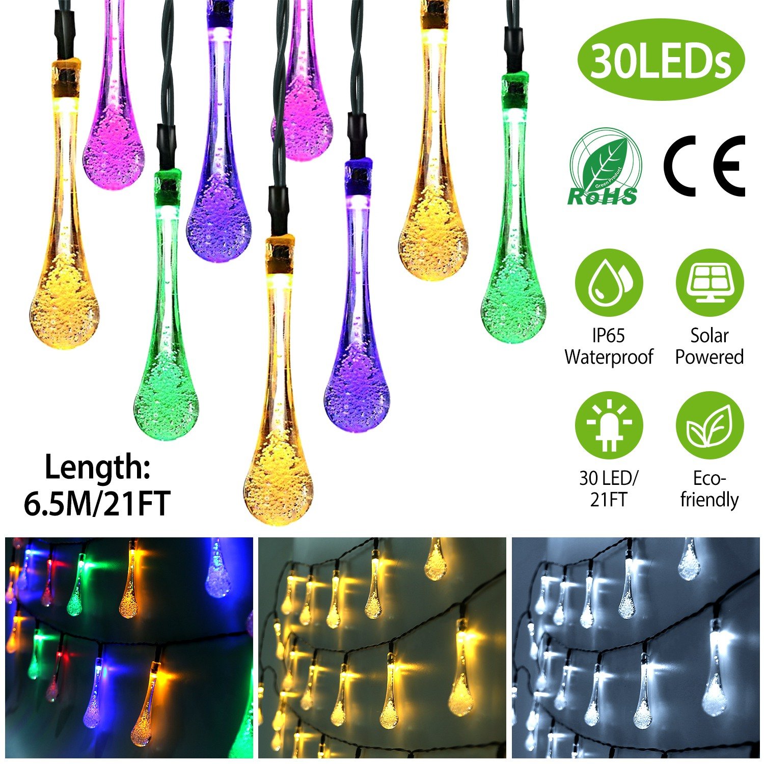 Home > Outdoor Solar String Lights 21 Feet 30 LEDs Water Drop Solar Powered Lights Waterproof Solar Fairy Lights Decorative Solar Powered Lights for Home Pat