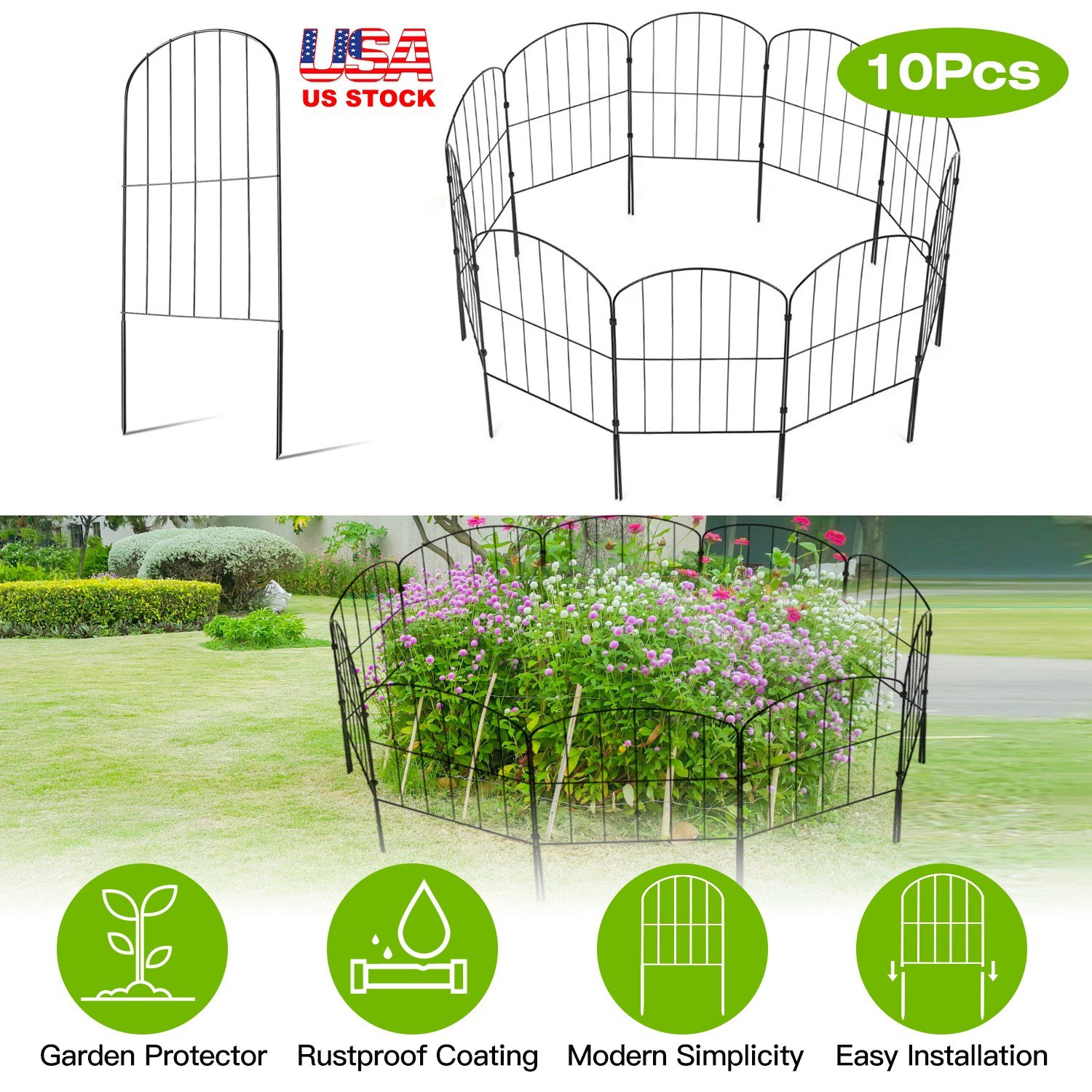 A must-have garden tool for garden enthusiasts who value both beauty and functionality. Package includes 10pcs black metal garden fences, each measuring 12.59" in width and 23.93" in length. Constructed with sturdy rustproof iron pipe, built to last for long time, special powder coating enhances the durability and rust resistance of these garden fences, making them suitable for all weather conditions. With its modern design and versatile features, these decorative garden fences will not only add an elegant touch to your outdoor space but also serve as an effective barrier to prevents curious animals from entering your yard, causing damage to your beloved flowers and plants, and avoids your pets from wandering off.
