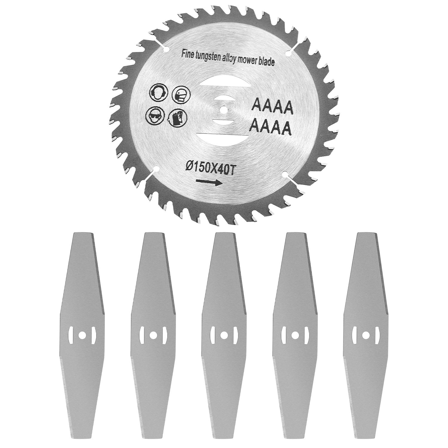 Made of high carbon steel alloy, our blades are sturdy and durable. Suitable for weed trimming, bush pruning, overgrown vine removing, tree cutting etc.. Easy to install, just take a screw through the hole in the middle, then attach the blade to the lawn mower with a wrench or screwdriver. 5Pcs alloy blades and 1pc saw blade, 6Pcs in total, sufficient for daily use and replacements.