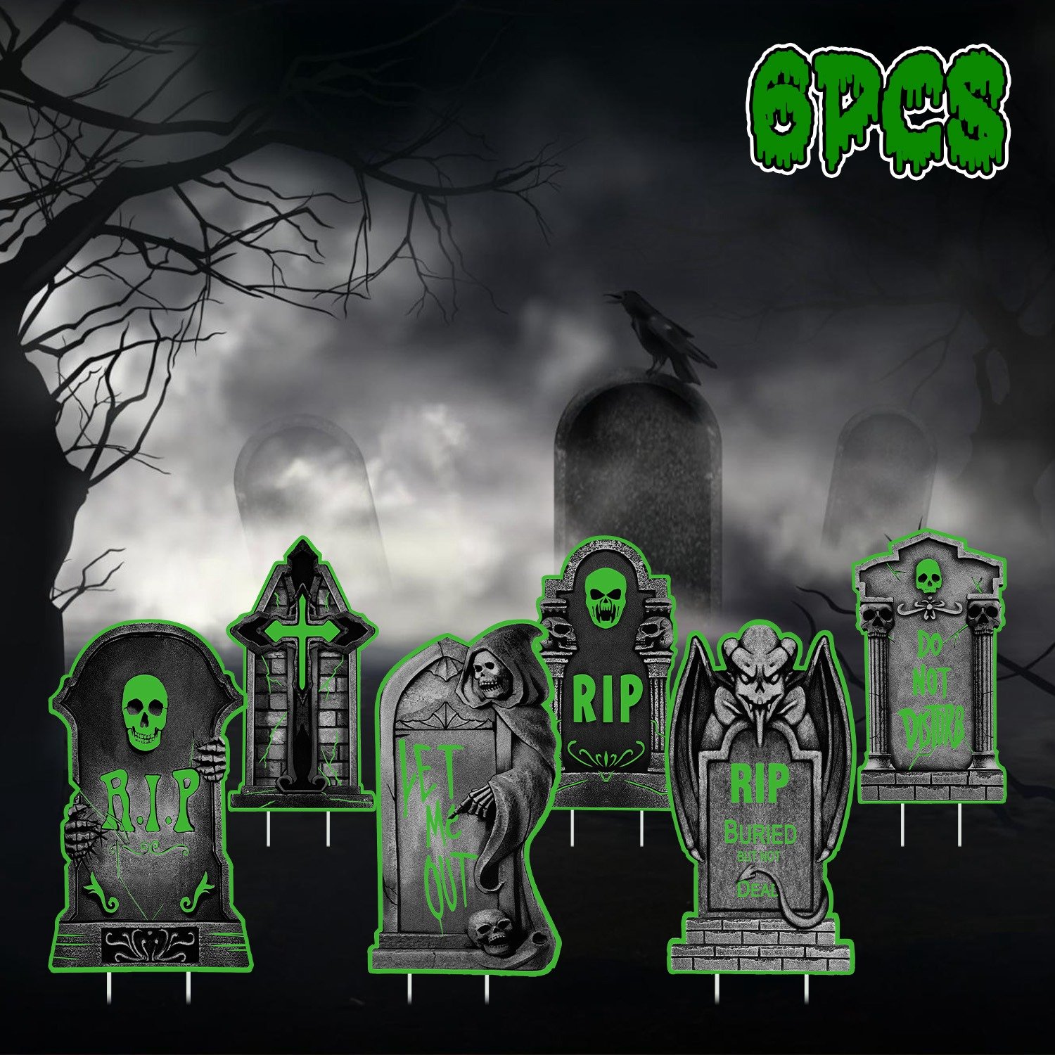 Home > Halloween Tombstone Yard Sign Decorations 6Pcs Glow in the Dark Halloween RIP Tombstone Fluorescence Lawn Sign with 12 Stakes for Haunted House Garden