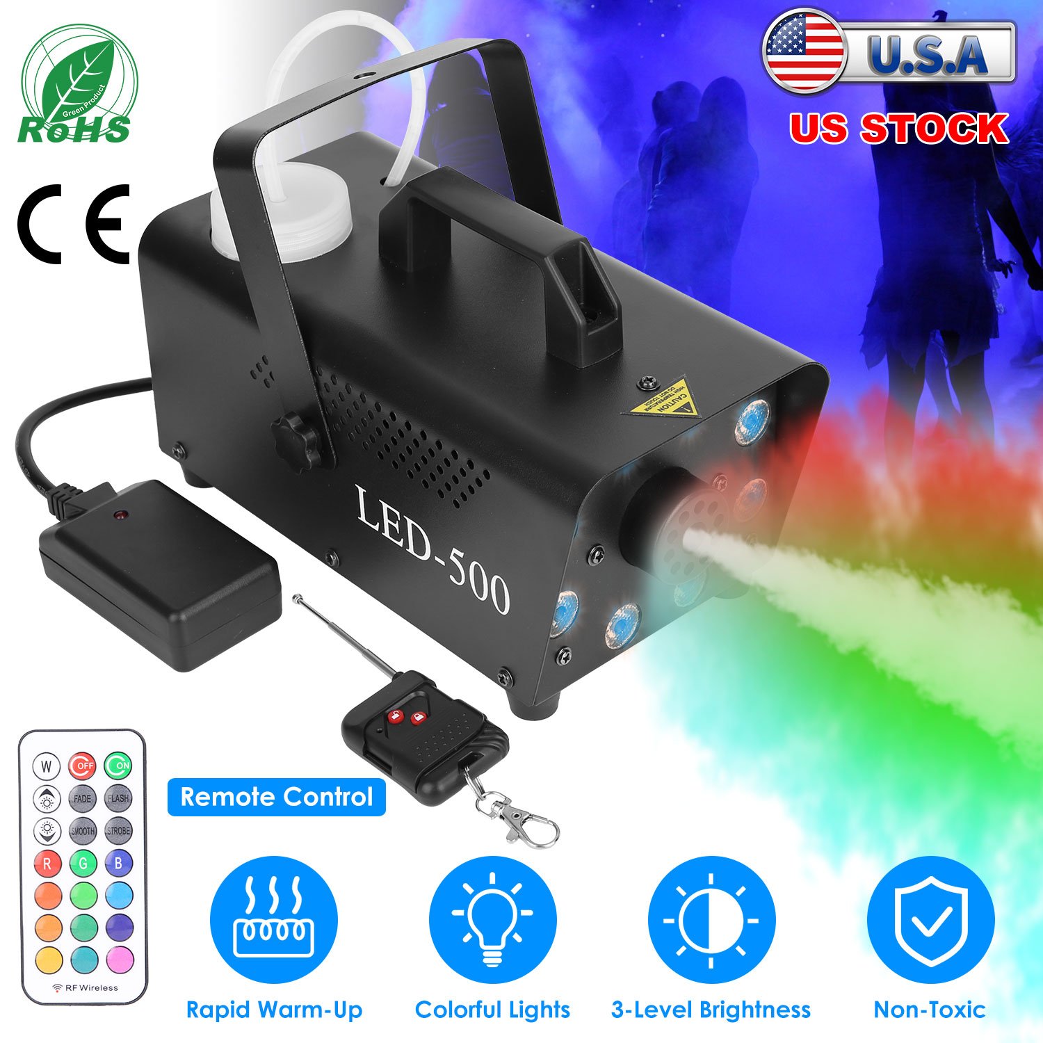 Add the fog fluid and start the machine. It only takes two steps and 2-3 minutes to produce colorful fog and make your party stage lively! 13 Steady lights and 4 lighting effects can create a stunning visual experience and captivating environments for all occasions. Coming with remote control and overheat protection mechanism, easy and safe to use. Widely used in a variety of occasions, such as wedding ceremony, Halloween, parties, Christmas, clubs, DJ performance and stage effect and so on, perfect for creating lively atmosphere of wildness.