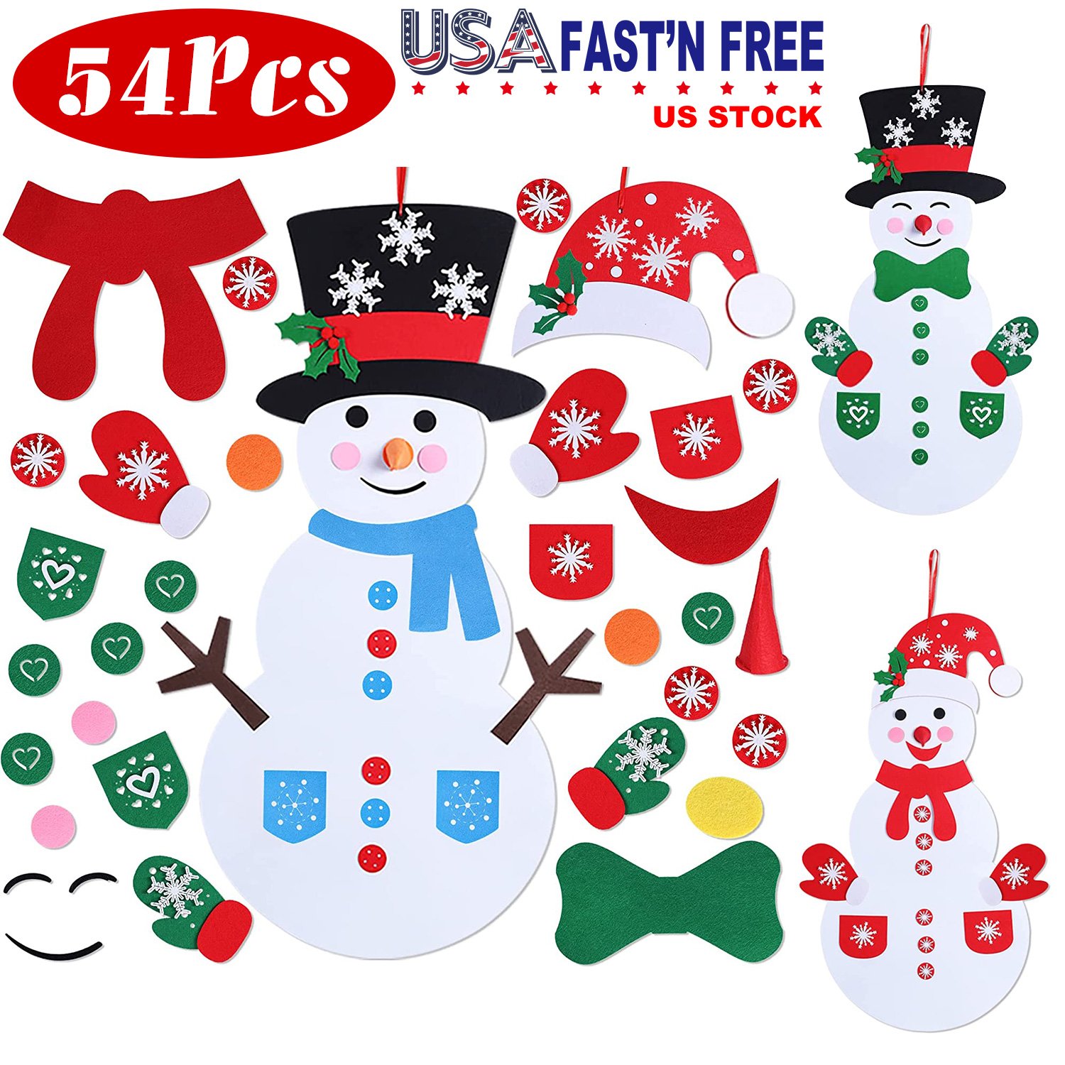 Christmas is coming! Why not choose our Felt Christmas Snowman Toy? All components is felt, not glued, no smell, can be easily fixed to the wall, hang on the door or play on the ground. Come with total 54pcs decor pieces, kids can combine more than 6 different styles snowman shapes, perfect DIY gift for them to inspire their imagination and creativity. It\'s also a cute and novel decoration for Christmas party, kids room and door hanging décor.