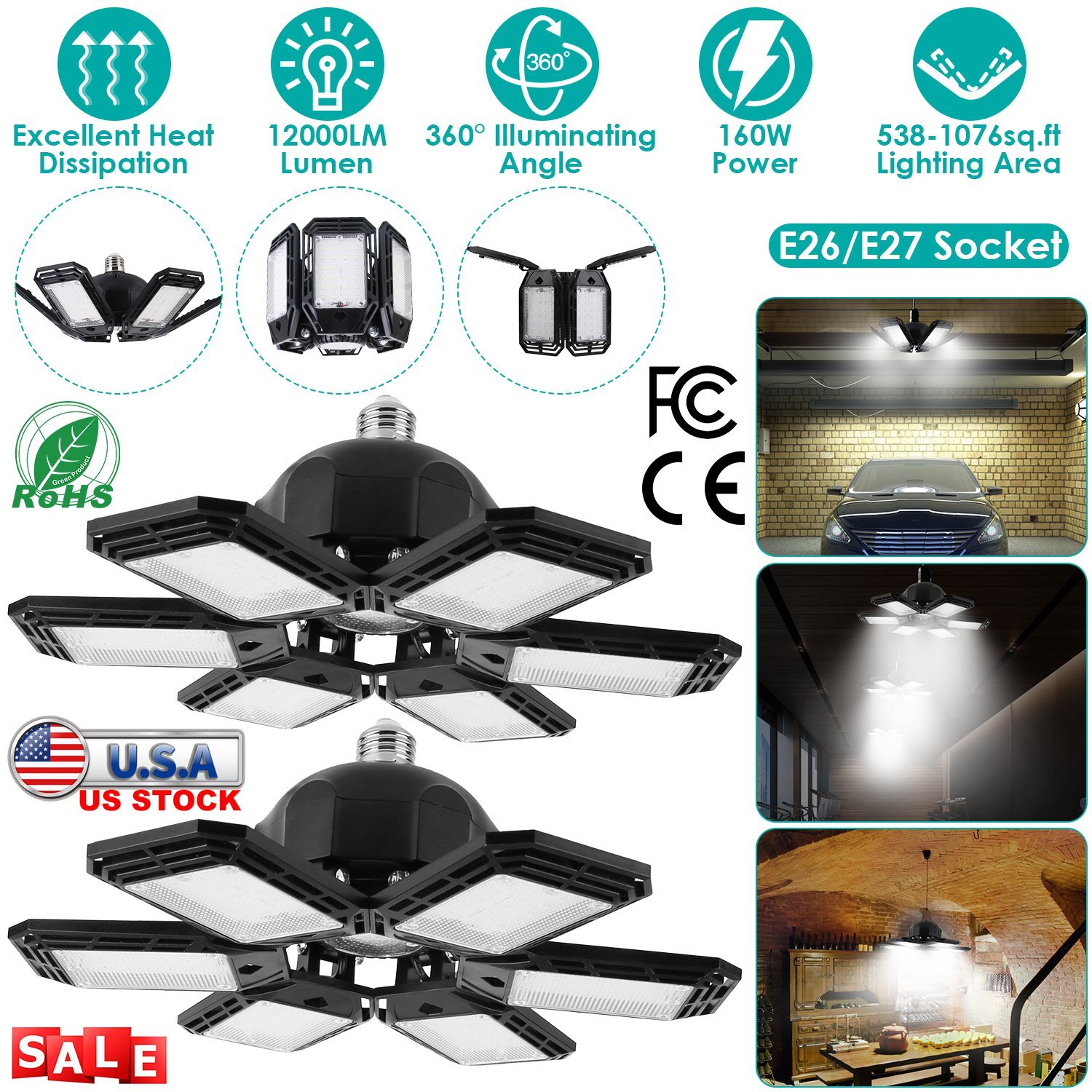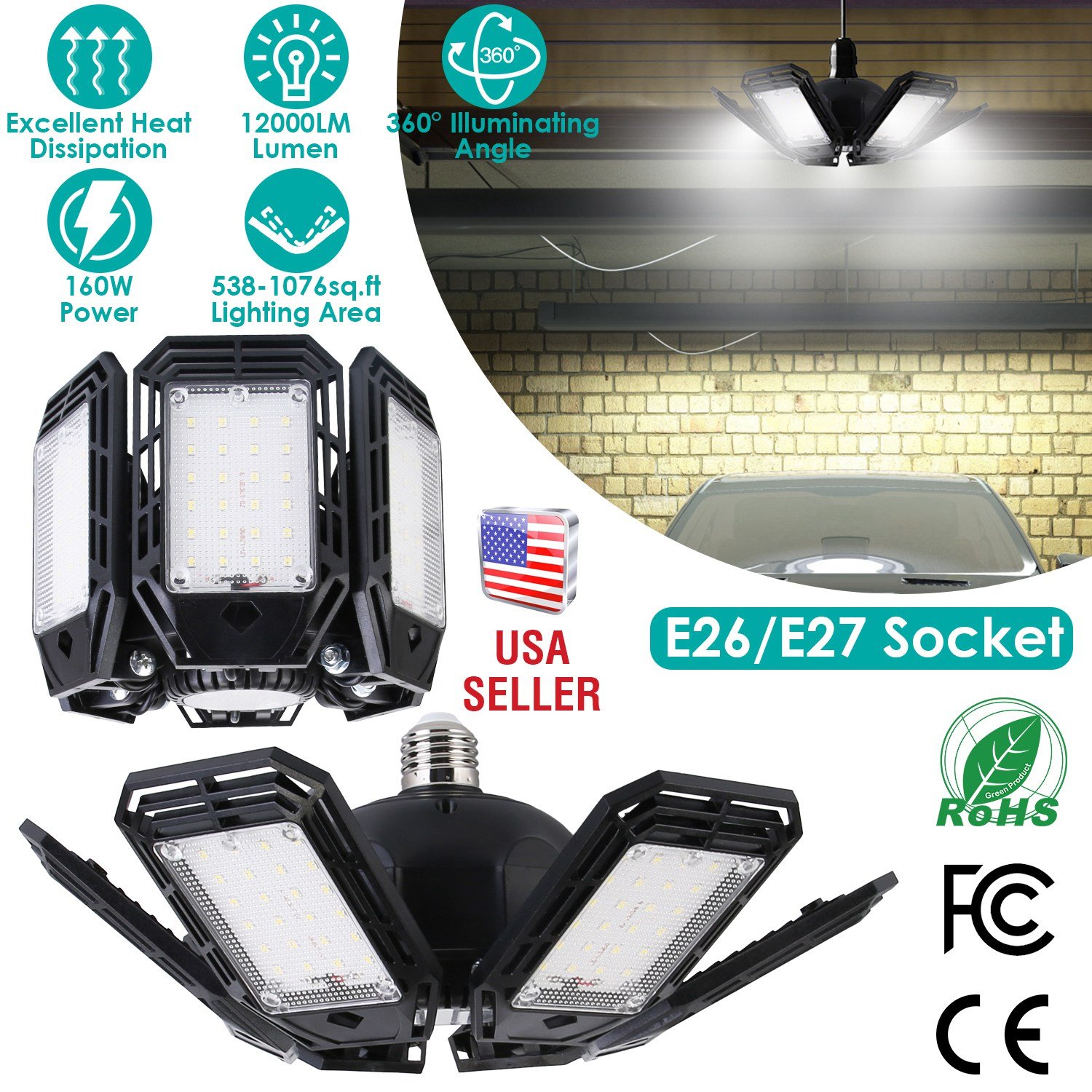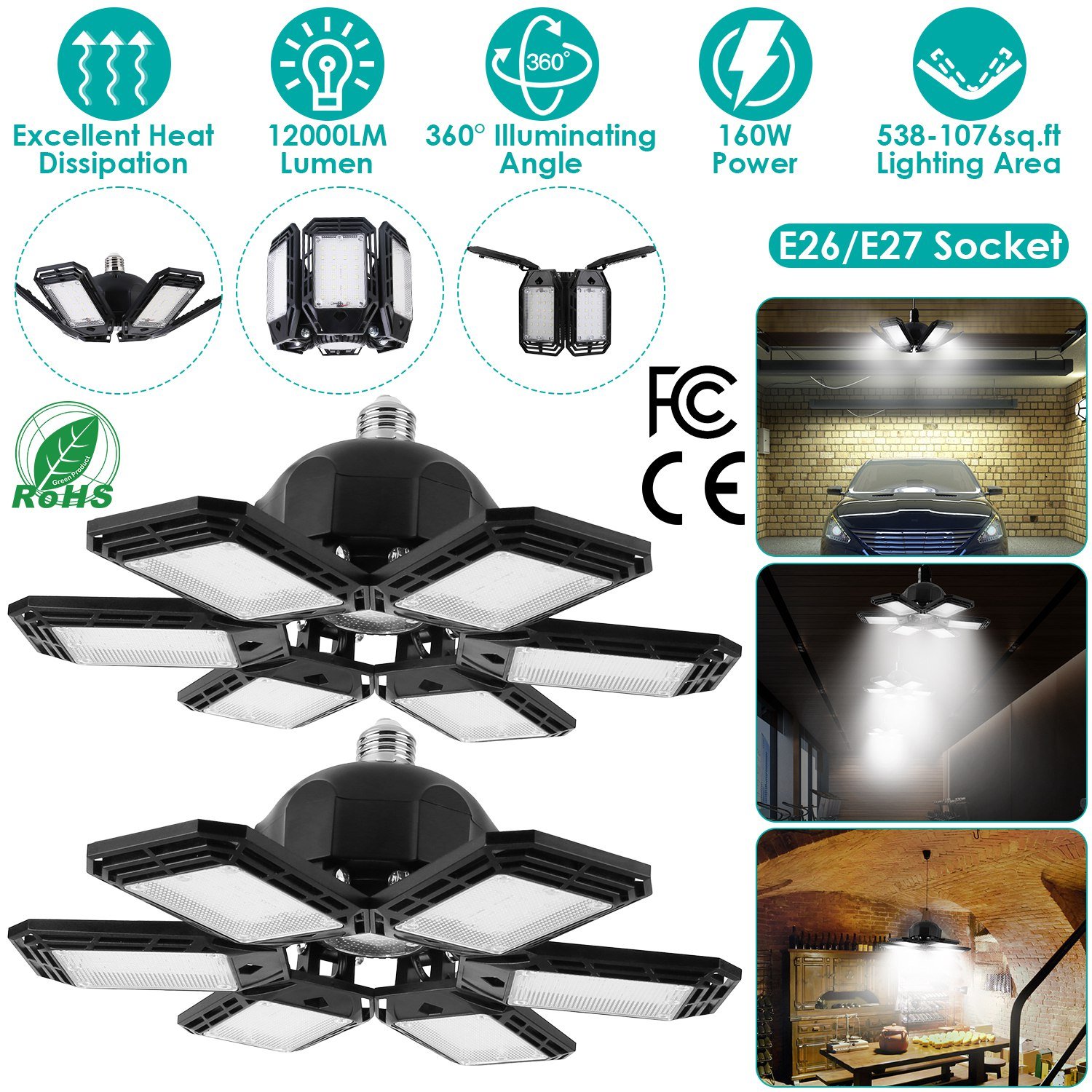 Our LED garage light, comes with 12000 lumens, overall 152Pcs upgraded LED beads, 90° adjustable lighting heads and nearly 360° lighting coverage, provide brightness for large area. Light up the entire room without blind spot. Multiple venting holes and advanced PC material provide better heat dissipation and sturdy construction. Just plug in E26/E27 light bulb base, no tools required. Optimal for garage, warehouse, basement, workshop, barn, corridor, office, exhibition area, stadium, gym, and etc..