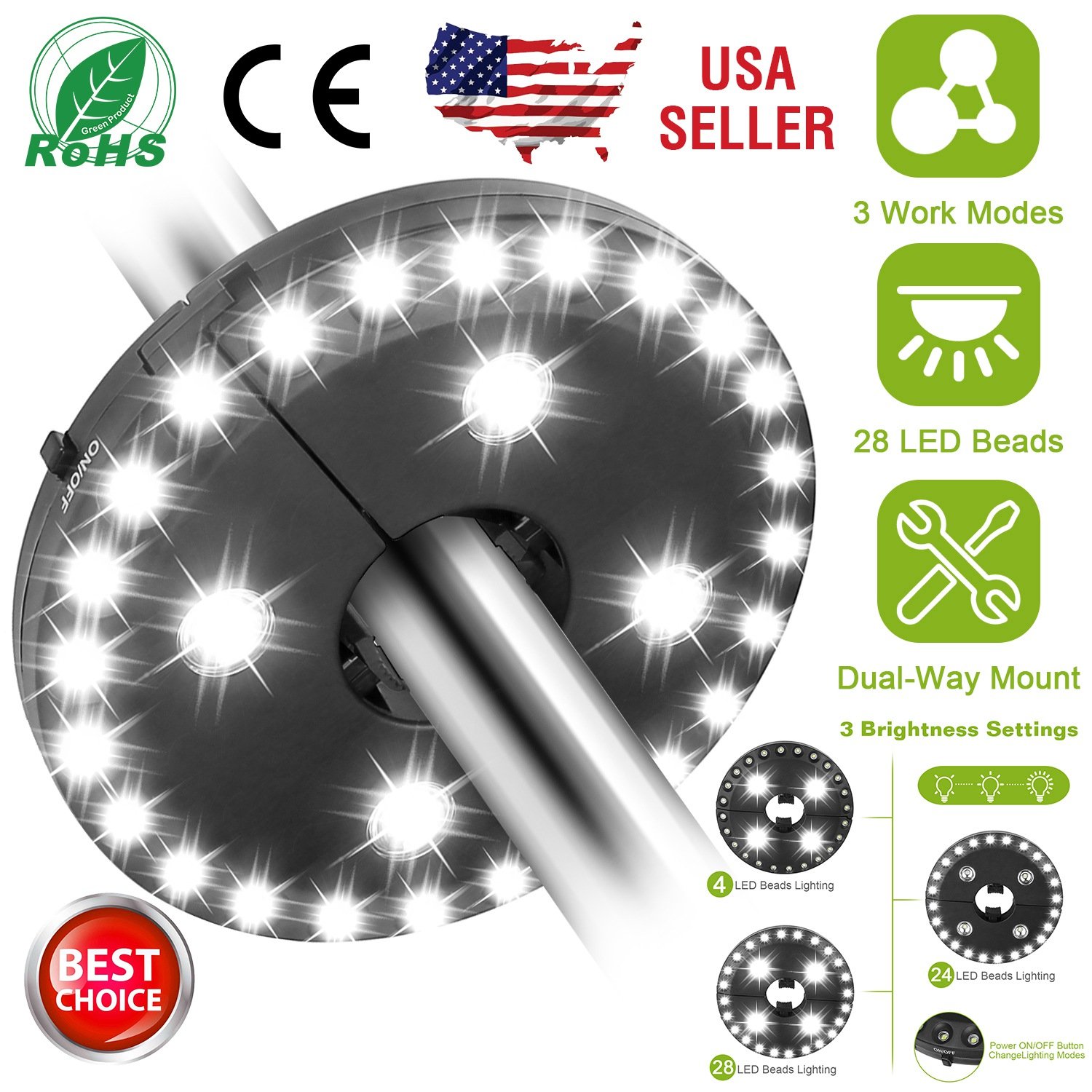 Our iMounTEK umbrella light lights on the beach, on your balcony, in your pool, when you no longer have sunlight or a fixed light spot. 3 lighting modes are offered so that you control the intensity of light and make the environment more comfortable for you and your guests. Dual-way fast mounting methods and can be mounted on pole with a diameter (0.79in-1.77in) or hang on with built-in hooks. Optimal for most outdoor activities.