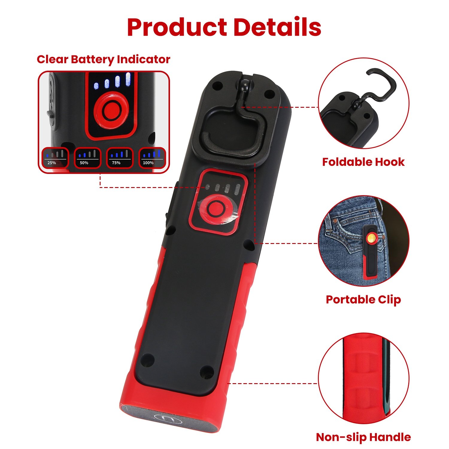 Do you often do repairing work? Then our portable LED work light is definitely for you! Our pocket light is endowed with 4 modes that cater to a variety of scenarios, such as hiking, camping, hunting, climbing, night walking, backpacking, caving, auto repairing in particular! The specially designed stepless brightness adjustment is a suprising bonus when using. The 360º rotatable hook allows you to attach it to belts, tool bags, or tent tops and the magnet base can firmly attach to various metal surfaces like car hood or steel shelf while repairing. What’s more, both the Hook and base are designed to be foldable and enable the flashlight to be so slim that perfectly fits your pocket for convenience. USB rechargeable and IP44 waterproof. A helpful assistant and thoughtful gift for repairers and adventurers!