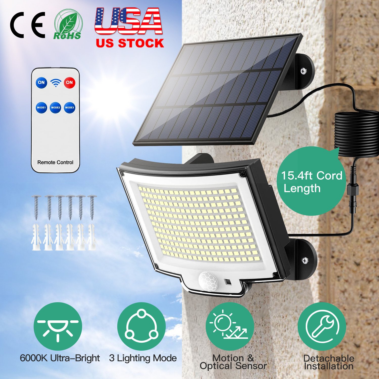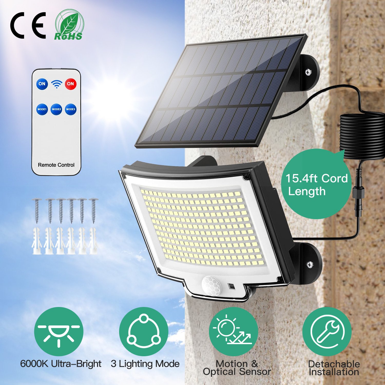 Our solar powered light adopts 228Pcs LED light beads, offer you powerful brightness and wide illumination. Designed with 3 lighting modes, you can freely choose different modes according to your personal demands by button control or convenient remote control. And we provide 15.4ft long detachable cable for you to flexibly install this solar light for more efficient charging. IP65 waterproof and durable material allow you to use it in various weather and diverse location.