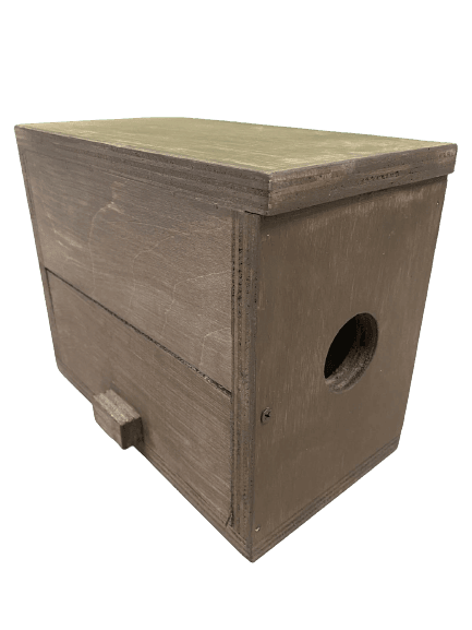 Extremely sturdy, weather resistant squirrel box that can be mounted in a tree for squirrels to gather nuts in. An easy to open door with optional locking mechanism via screw included. This squirrel / chipmunk house is extremely sturdy using 3/4" wood with a traditional, weather resistant, nut colored stain to match the great outdoors. A 2" opening on the right side allows squirrels to enter and exit the squirrel house with ease. This squirrel box is the perfect mechanism to gather organic nuts. Dimensions: 12"L x 6.5"W x 7.5"H. 3.5 Pounds.