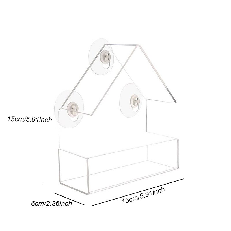 Product Name: Bird feeder. Product material: Acrylic. Product features: The hanging wall of the; Transparent color; Adjustable position position. Product use: Feed the birds. Product size: 15 X 6 X 15c; 5.91 X 2.36 X 5.91inch. TIPS: The data is measured by hand and there may be an error of 1~3 cm.