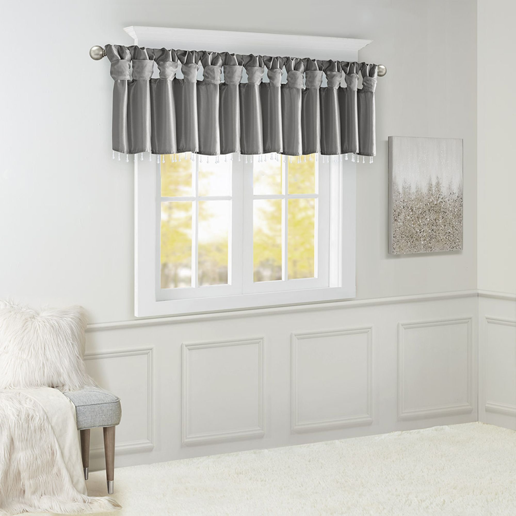 Give your home a decorator's touch with the Madison Park Emilia Window Valance. Made from a faux silk fabric, this elegant window valance features a DIY twist tab top finish that creates rich deep folds, combined with a beautiful bead trim for an alluring charm. Added lining offers more privacy and a fuller appearance, while the luxurious sheen and rich charcoal tone provides a touch of sophistication to your decor. Easy to hang, this tab top valance updates any decor into subtle glamour. Hanging instructions are included. Fits up to a 2" diameter rod.