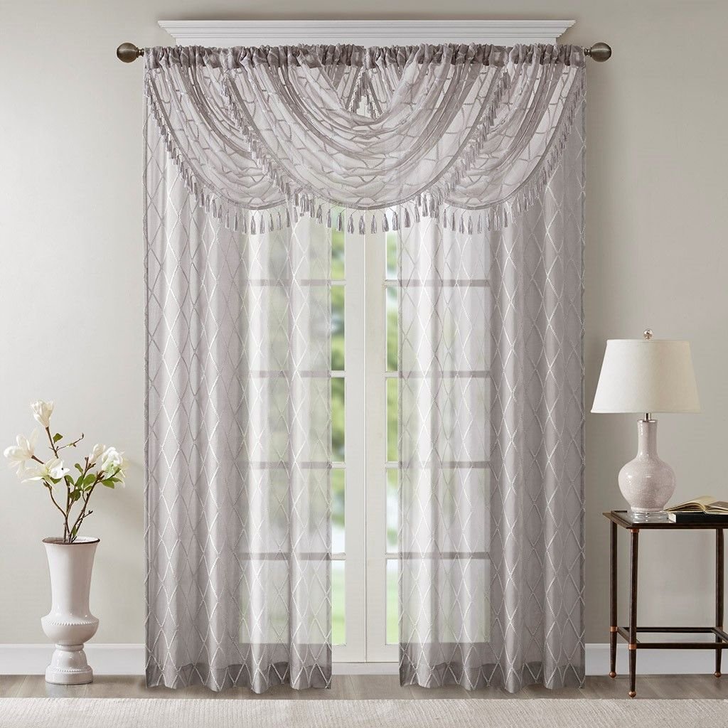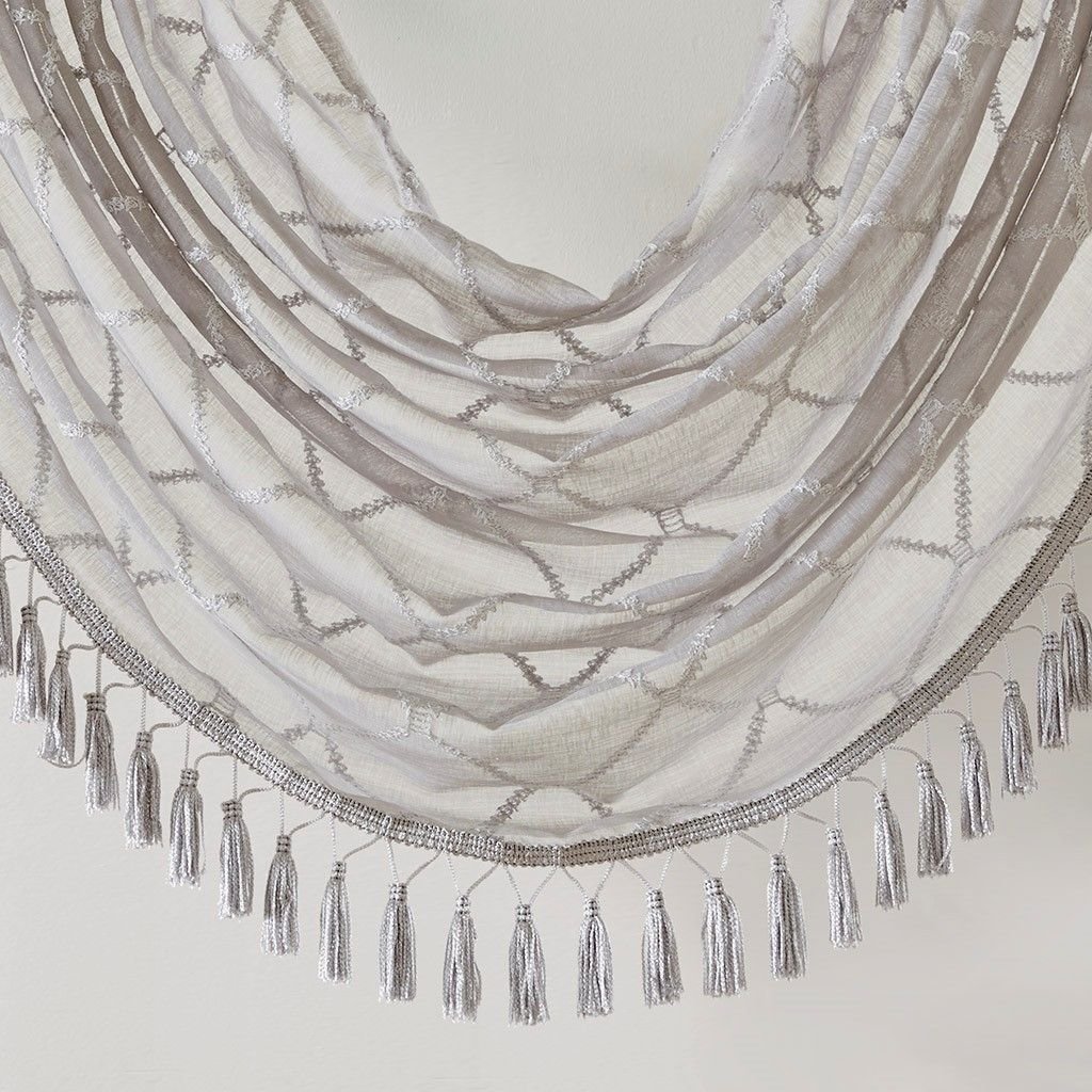 Madison Park's Irina Diamond Sheer Waterfall Valance provides an alluring update to your home. An elegant diamond pattern is beautifully embroidered on a soft sheer fabric, adding grace and charm to your décor. The neutral colors and light fabric helps create a delicate look to soften any room, combined with the beautiful tassel trim and rich draping details, makes this the perfect dressing to any window. Complete the look with coordinating window panels, sold separately. Multiple valances used to create this look.