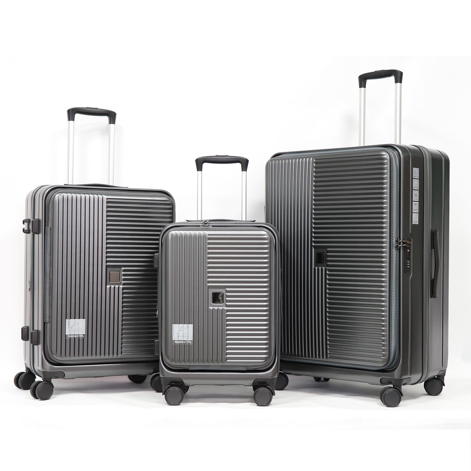 3-Piece Luggage Set, Hard Shell 20", 24", 28"One set meets all your different travel needs. The 20-inch carry-on suitcase features a front-opening lid with a laptop compartment and mesh pockets, making it convenient to access your belongings at any time. The 24-inch and 28-inch suitcases also have front-opening lids, offering more capacity than regular luggage. Each size can be expanded by 20% for extra space.