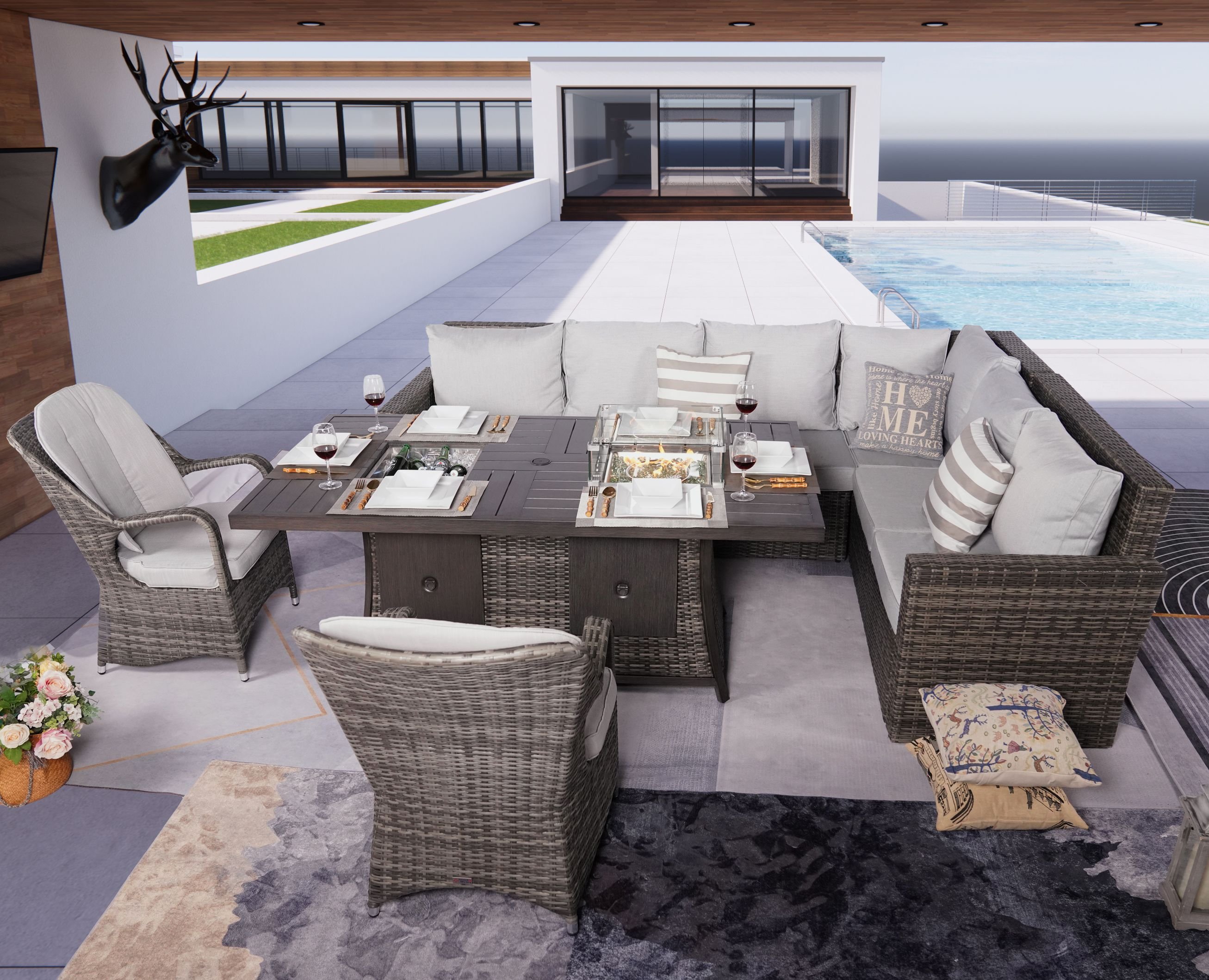 Brighten the look of your outdoor space with this NEW 7-Piece Patio Gray Conversational Sofa Set With 1 Gas Firepit And Ice Container Rectangle Dining Table And 2 Dining Chairs. We upgrade the fragile glass and rattan tabletop to a brown finish aluminum coating tabletop, which can extend the service life of this product.  In addition to the original firepit system, we have added an ice container function, which allows you and your family to enjoy the beautiful fire while also enjoying a delicious beverage.  It can meet your various outdoor needs. The encounter of fire and ice will bring you double enjoyment.