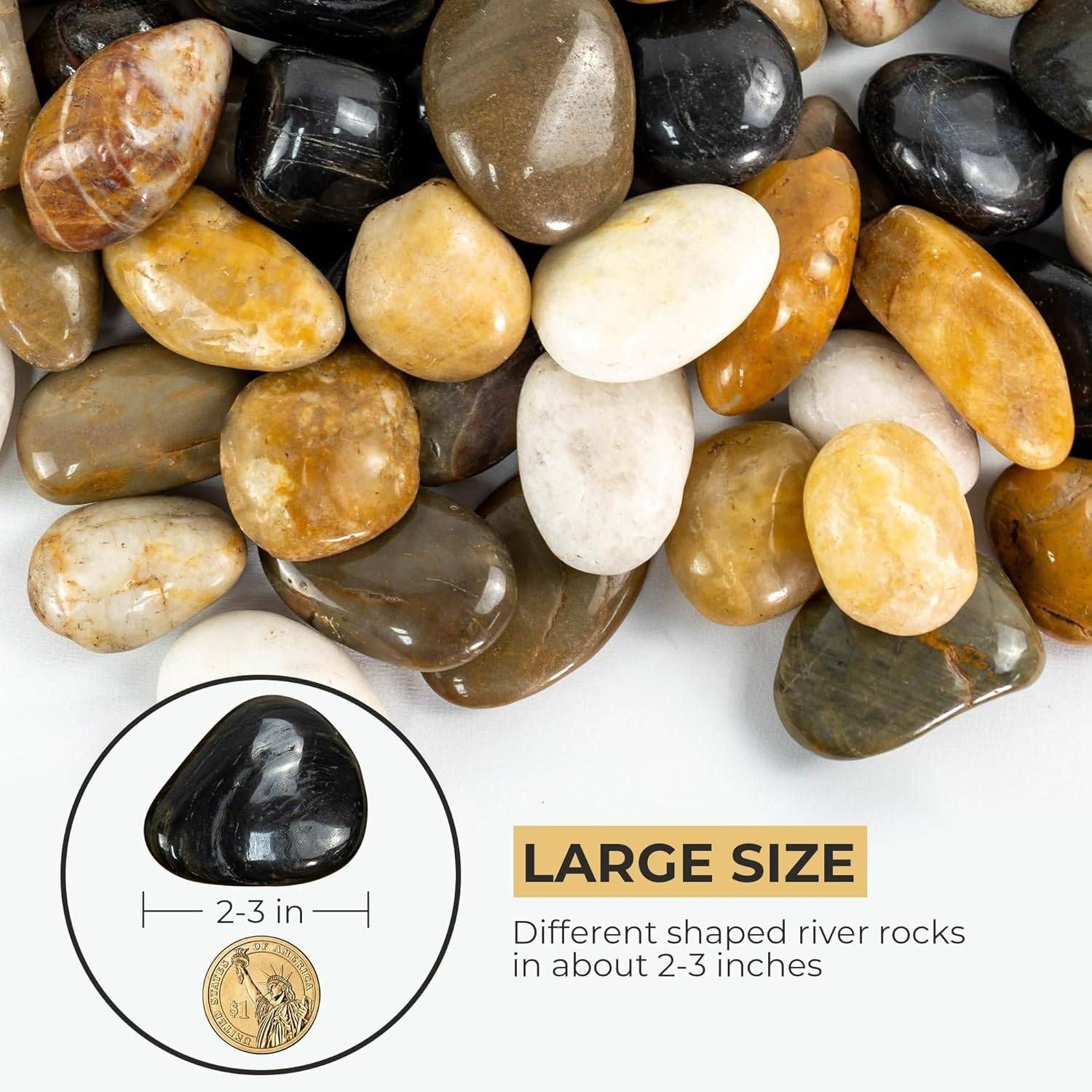 These 38lb natural Multicolor river rocks (2-3 inch polished pebbles) feature a smooth, high-shine finish with subtle natural variations of grey and yellow, perfect for both indoor and outdoor decorative use—ideal for succulent plants, potted cactus, aquarium/fish tank decor, garden landscaping, walkways, DIY crafts, and more, providing excellent drainage while retaining soil moisture, made with only pure paraffin-coated stones for a non-toxic, eco-friendly solution, and backed by comprehensive customer support for all your decorative stone needs.