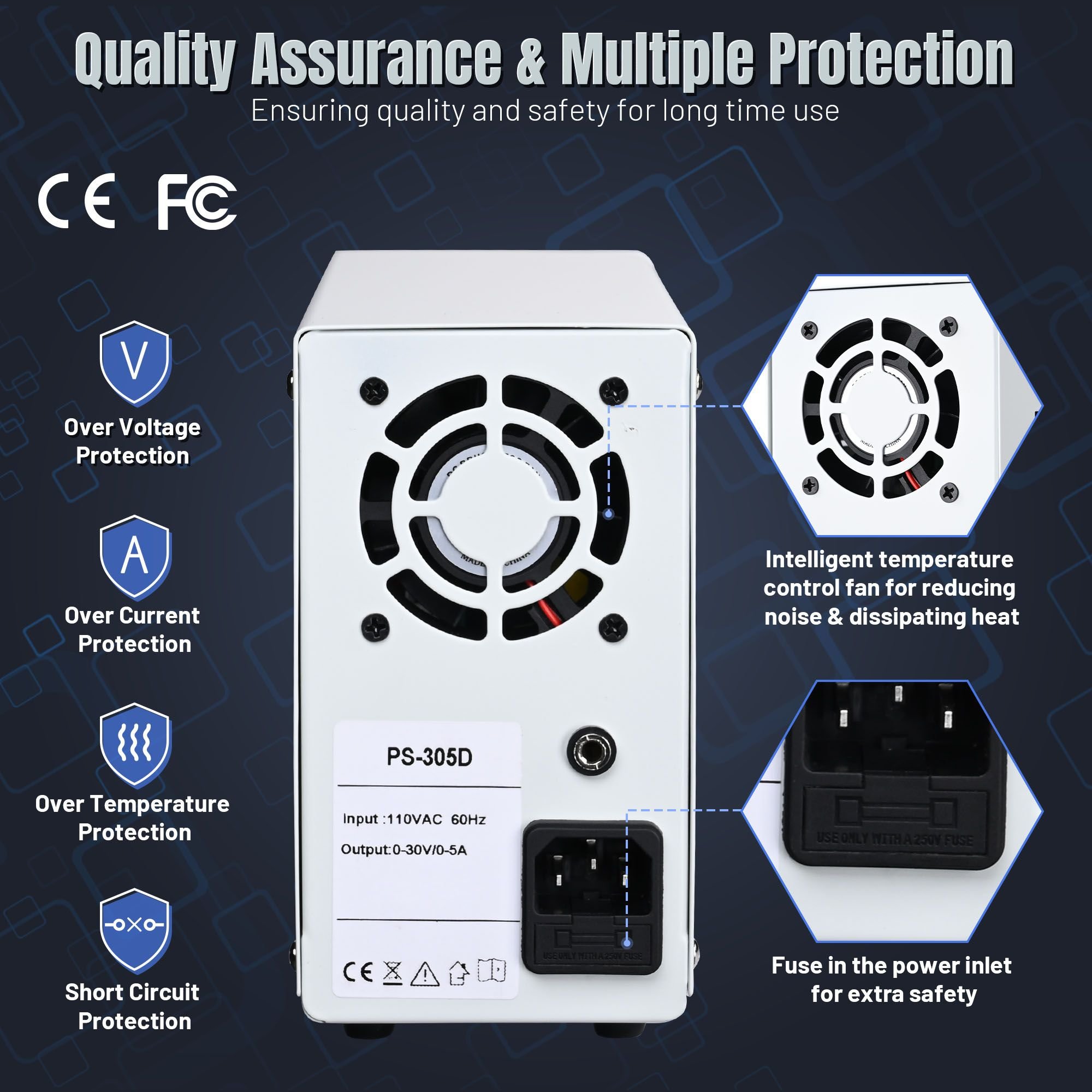 - Multiple Protection - Over voltage (OVP), open circuit (OCP) and over temperature (OTP) protection for preventing power supply from short-circuit and damage; With fuse in the power inlet port for adding extra safety; Intelligent temperature control fan adjusts the speed for reducing noise and dissipating heat for longtime use