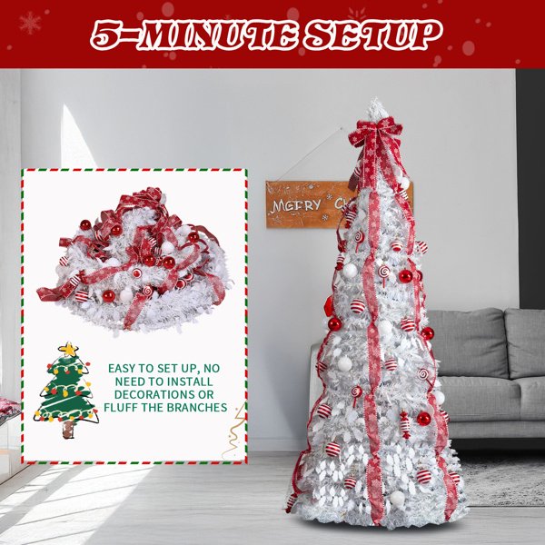 1. Fully Decorated: This fully decorated pop-up Christmas tree takes the stress out of holiday decorating. With its lifelike branches adorned with various styles of balls, white leaves, twinkling fairy lights, candies and ribbons, it brings festive magic to your space in seconds—no additional decor needed.