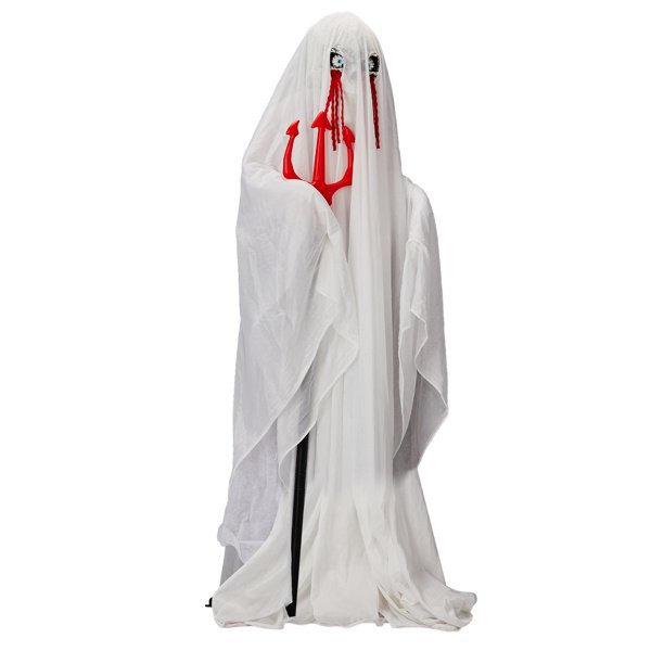 Bring your Halloween scene to life with this terrifying animatronic ghost with trident. Standing at life size, this sound-activated Halloween decoration is designed to shock and thrill. Once triggered, the ghost's glowing green body light up and eerie sounds play, creating an unforgettable spooky experience. Ideal for haunted houses, yard displays, or indoor Halloween parties, it sets up in just minutes and runs on batteries, giving you complete freedom to place it wherever the scares are needed most.
