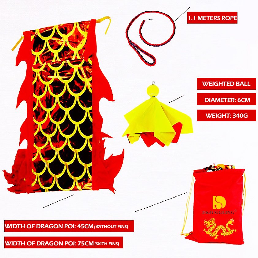 3D Dragon Poi with 340g Weighted Ball & 1.1 Meters Swing Rope - Silk Flowy Shaking & Flinging Chinese Golden Dragon Ribbon Streamer + Travel Bag.