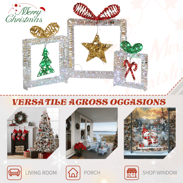 Create a warm and festive atmosphere with this enchanting set of Christmas lighted decorations. Perfect for both indoor and outdoor use, these glowing holiday displays will instantly brighten up your home, yard, or patio, making them a great addition to your seasonal décor. With durable construction and weather-resistant materials, these decorations are designed to withstand winter conditions, ensuring that they will bring holiday cheer year after year. Easy to set up and store, they provide a hassle-free way to enhance your holiday celebrations.