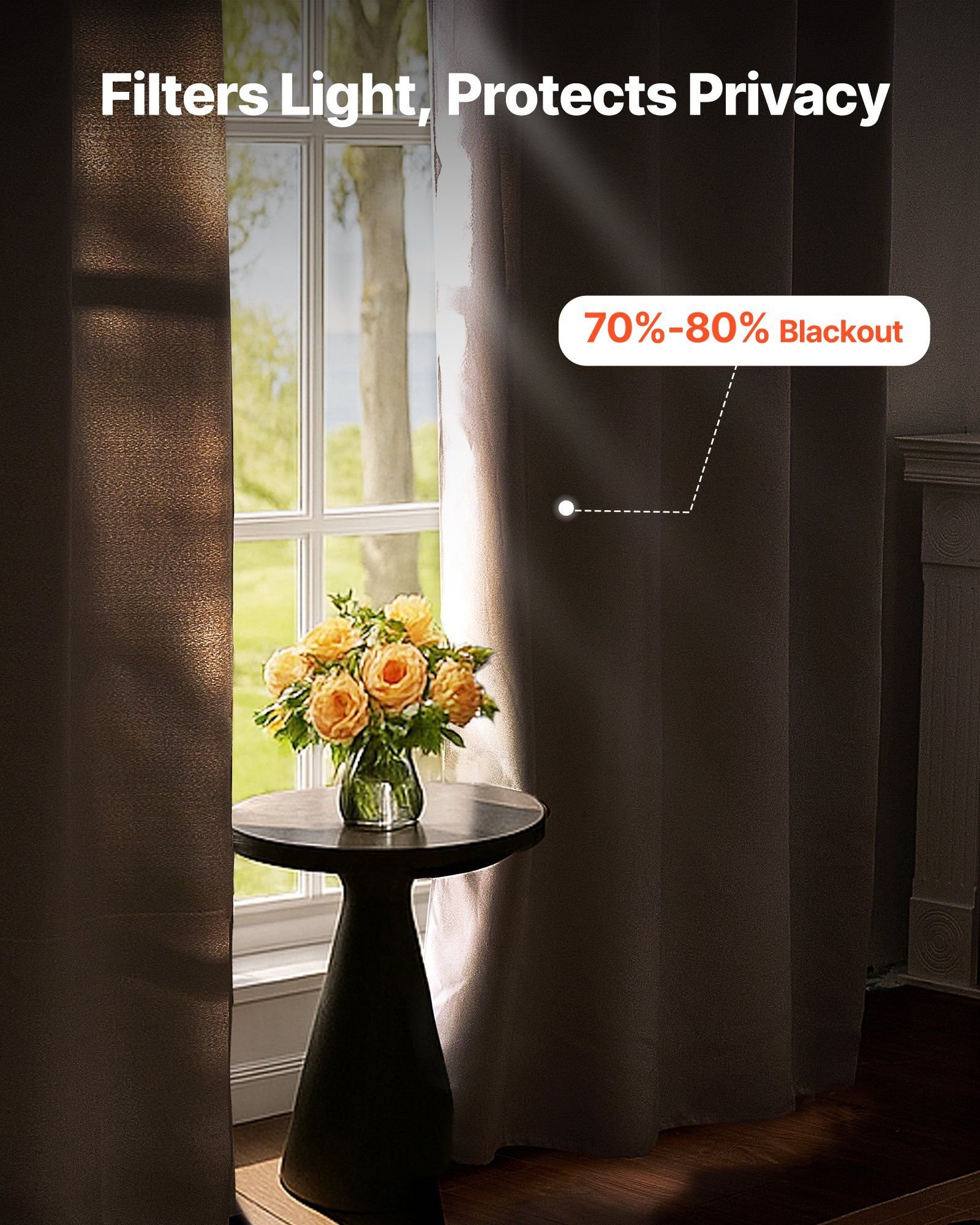 1.Effective Blackout: Filters 70%-80% of strong light. During the day, pull the blackout curtains to enjoy clear, non-reflective images. At night, the curtains block indoor light completely. Ideal for both living rooms and bedrooms