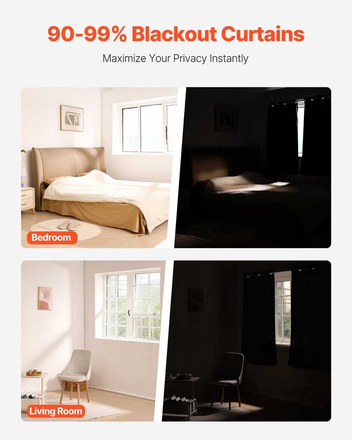 1.Superior Blackout Performance: Our blackout curtains block 90-99% of sunlight, maximizing privacy and creating a pitch-dark environment instantly. They are suitable for bedrooms, living rooms, and other spaces where complete darkness is needed for quality sleep
