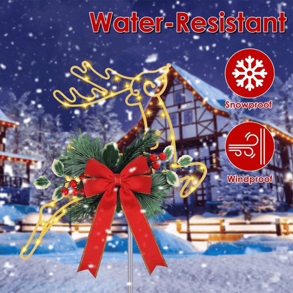 This elegant Christmas reindeer decoration features golden reindeer, delicate bows, pine needles, and berries, creating eye-catching display. The 9.84FT string light includes 30 warm yellow LED beads, powered by 2 AA batteries (not included), adding a charming glow to your holiday decor. Easy to assemble without tools. Simply connect the stake poles and place them in soft soil or a suitable surface. Made with rustproof metal poles, these decorations can withstand harsh weather and are reusable. Perfect for gardens, lawns, pathways, patios, and more, they also make a thoughtful gift for loved ones.