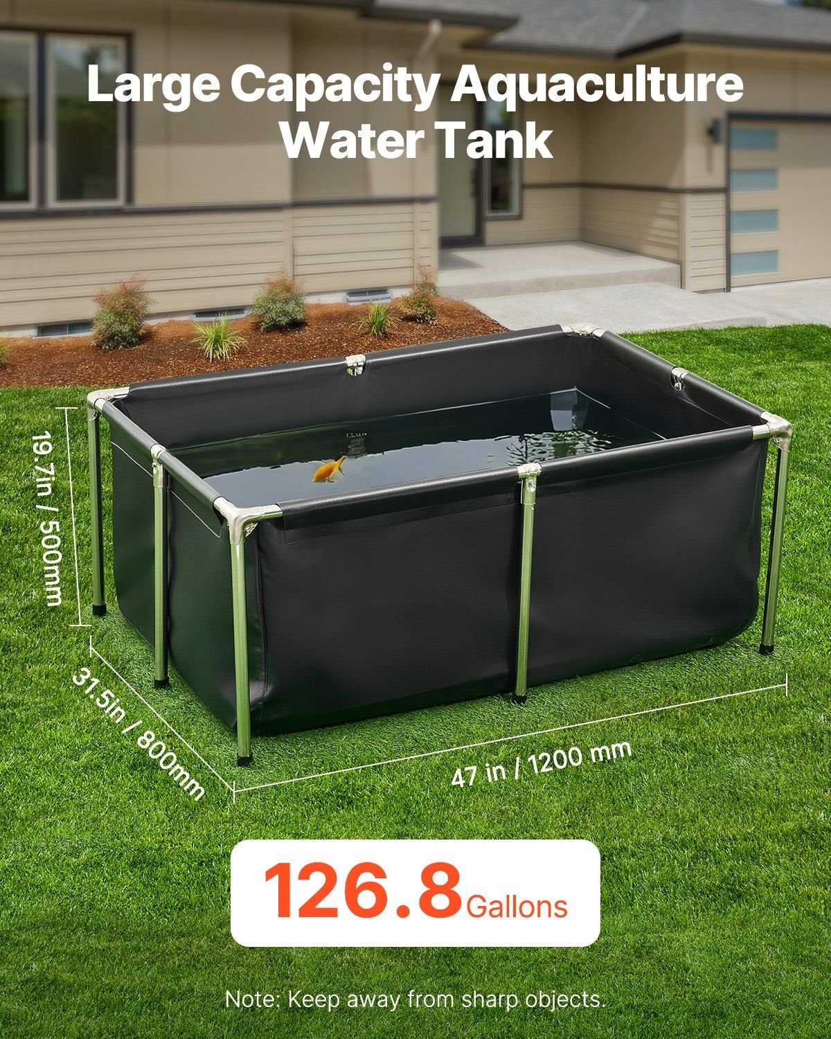4.Large Capacity: This PVC fish pond measures 47 x 31.5 x 19.7 in (1200 x 800 x 500 mm) and holds up to 126.8 gallons, providing ample space for aquatic life. It is ideal for indoor and outdoor aquaculture.
