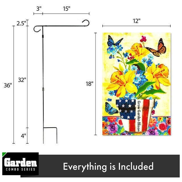 Combo Pack Garden Flag Stand Black 36x16 Inch & Garden Flag Garden Spring Bloom USA Flower Pot with Butterflies 12x18 Inch