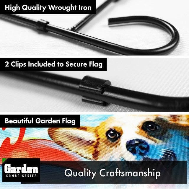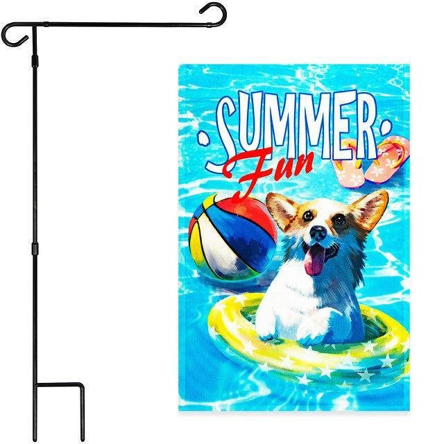 Combo Pack Garden Flag Stand Black 36x16 Inch & Garden Flag Summer Fun with Dog in Pool 12x18 Inch