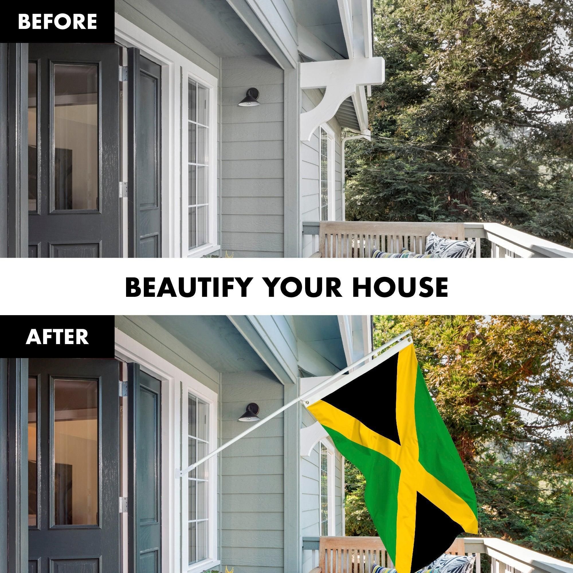 1.deluxe package: is including a 3x5 ft printed jamaica flag with brass grommets for this deluxe flag and flagpole package! all the guarantees of the quality of our flag is included in this package. tangle free: both mounting rings spin at respective positions so the flag is protected and never tangles. this free rotation system allows the flag to wave undeterred by the flag pole. heavy duty: rust resistant aluminum alloy allows the flag pole withstand the harsh weather conditions. multiple
