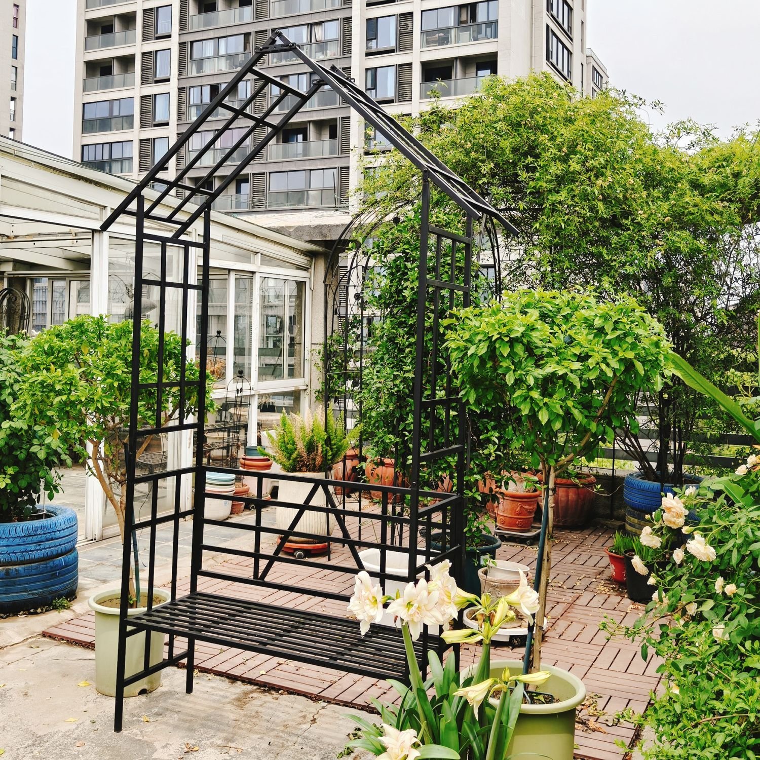 Metal Garden Arch with Bench Turned into Flower Stand W58.07*H97.24 Climbing Plants Support Rose Arch Outdoor Black Metal Garden Arch with Bench Turned into Flower Stand W58.07*H97.24 Climbing Plants Support Rose Arch Outdoor Black Metal Garden Arch with Bench Turned into Flower Stand W58.07*H97.24 Climbing Plants Support Rose Arch Outdoor Black