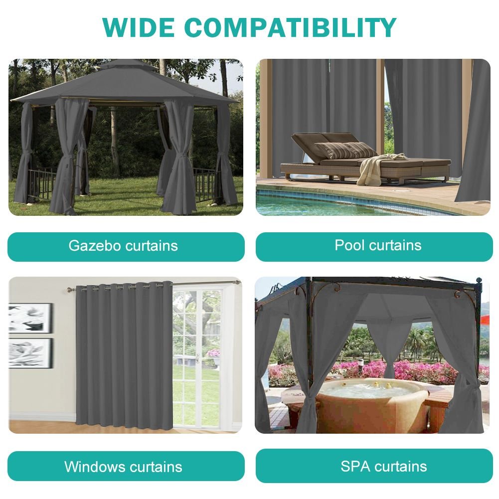1.Perfect material:1 panel curtain per package outdoor blackout curtains adopts super soft polyester fabric which is waterproof mildew mold resistance wrinkle free machine washable and easy to clean drapes with a damp cloth or wash them off with the water hose