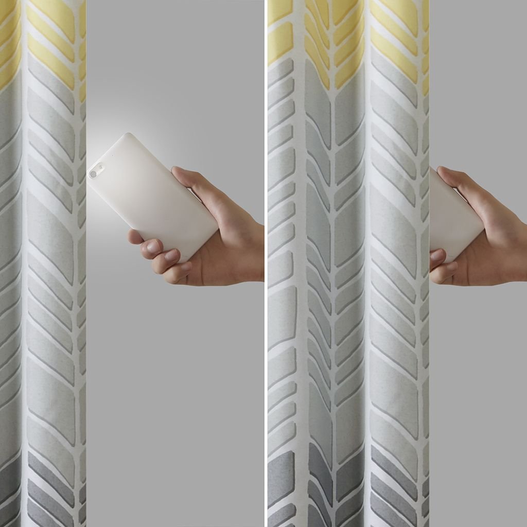 Create a color blocked look in your room with our Intelligent Design Adel Total Blackout Window panel. This geometric chevron design uses light grey, taupe, and aqua for a unique combination of color and pattern. Finished with a heavy 3 pass foamback liner, this panel is 100% total blackout for a maximum barrier against all exterior light and noise intrusion for the utmost privacy, while the thermal technology provides energy efficiency. Grommet top makes this panel easy to hang, open, and close through the day; fits up to a standard 1.25" diameter rod. Machine washable for easy care; complete the collection with coordinating bedding and shower curtain sold separately.
